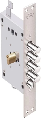Корпус замка Рубин 1.08.21 с тягами для бронированных и металлических дверей усиленной конструкции. 4 класс безопасности. Имеет уникальную защиту от выбивания цилиндрового механизма. В случае выбивание цилиндрового механизма срабатывает защитный внутренний элемент, блокирующий засов замка в закрытом положении. Таким образом дверь остается закрытой и злоумышленник не может попасть внутрь. В корпусе замка есть отверстия под стяжные винты для крепления дверной ручки к корпусу замка. Также в корпусе замка предусмотрены отверстия для установки различных видов броненакладок.