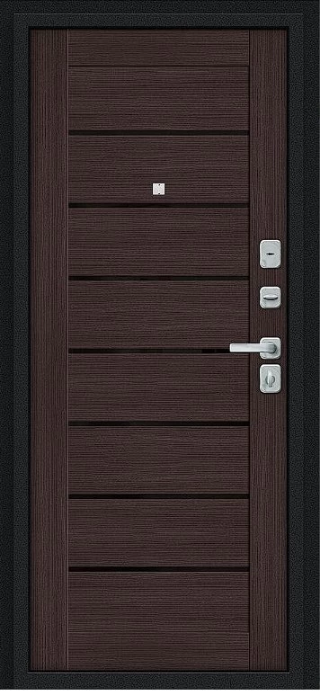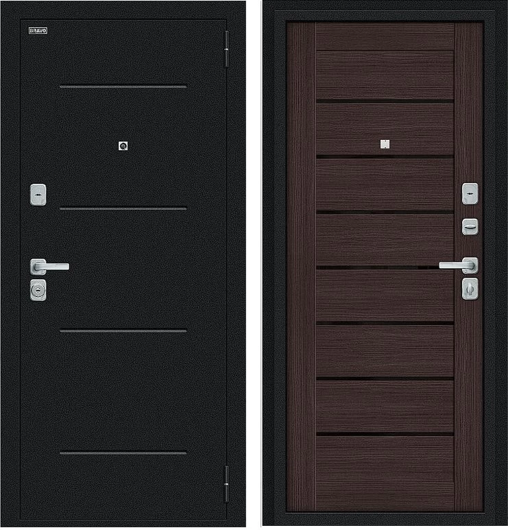 Надежная входная Дверь Браво Техно/BChrome Букле черное/Wenge Melinga премиум класса по цене 34 675 руб. Большая толщина стали защитит от проникновения в ваш дом, квартиру или коттедж. Используется очень качественная фурнитура: замки, цилиндры, ручки, защелки. Покрытие и отделка двери изготовлено под внимательным контролем производителя. Дверь имеет долгий срок службы и гарантию.
