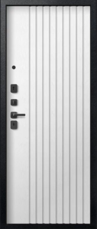 Надежная входная Дверь V-15 Черный муар + Бетон темный - Софт ясень белый премиум класса по цене 43 475 руб. Большая толщина стали защитит от проникновения в ваш дом, квартиру или коттедж. Используется очень качественная фурнитура: замки, цилиндры, ручки, защелки. Покрытие и отделка двери изготовлено под внимательным контролем производителя. Дверь имеет долгий срок службы и гарантию.